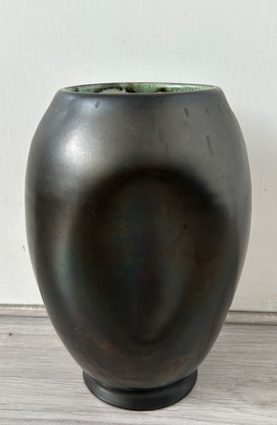 Nagtegaal vaas antracietNagtegaal handwerk vaas met 'deuken' uitgevoerd met antracietkleurig glazuur.