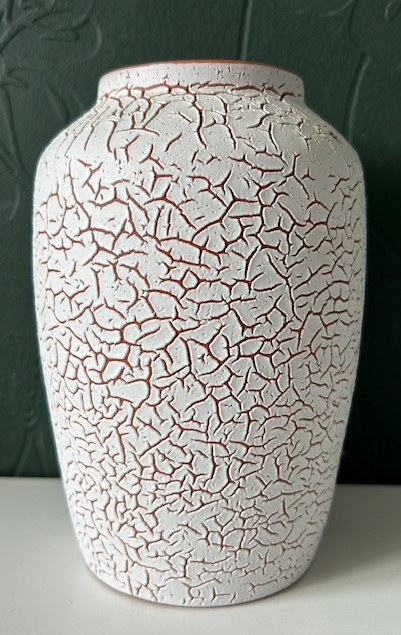 Vaas keramiek wit craqueléRoodbruin geglazuurde vaas uitgevoerd met een witte craquelé laag. Door het craquelé heen kun je de kleur van de onderlaag zien. Deze bewerkte vazen met bijv. schuim- of craqueléglazuur waren begin jaren zestig erg…