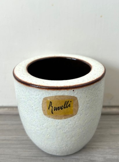 Ravelli sigarettenbeker witPotterie Ravelli dikwandige sigarettenbeker, wit geglazuurd met bruine rand. Het bekertje maakt deel uit van een rookset (samen met asbak en stamper) die in de jaren vijftig veel werden verkocht door Ravelli.