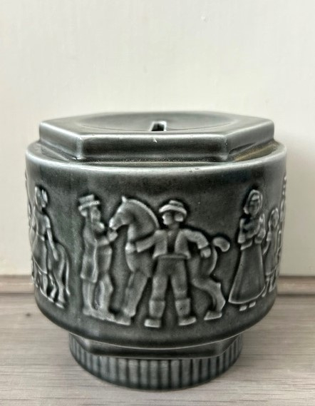 Rörstrand geldbusje grijsRörstrand grijsgroen geldbusje van de Soderslatts Sparbank. Het geldbusje is voorzien van een reliefdecor met vrouwen, mannen en kinderen. Een decoratief spaarpotje compleet met sleutel.