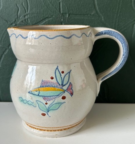 Goedewaagen kannetje vissenGoedewaagen cremekleurig geglazuurd kannetje met een handgeschilderd decor van vissen en waterplanten.