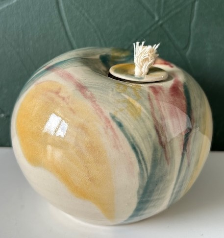 Potterie Egbert olielampjePotterie Egbert handgevormde olielamp met katoenen lont. De crèmekleurige olielamp is gedecoreerd in de kleuren geel, lila en lichtgroen.