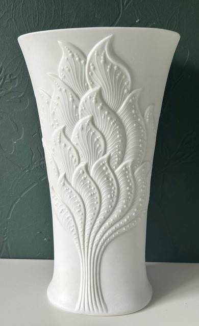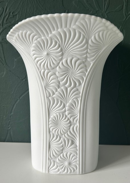 Kaiser Op-art vaas porselein floraal decorKaiser Op-art (optical art) vaas van mat biscuit porselein. De vaas is gedecoreerd met een floraal blad patroon in reliëf. De bovenkant is ovaal van vorm.