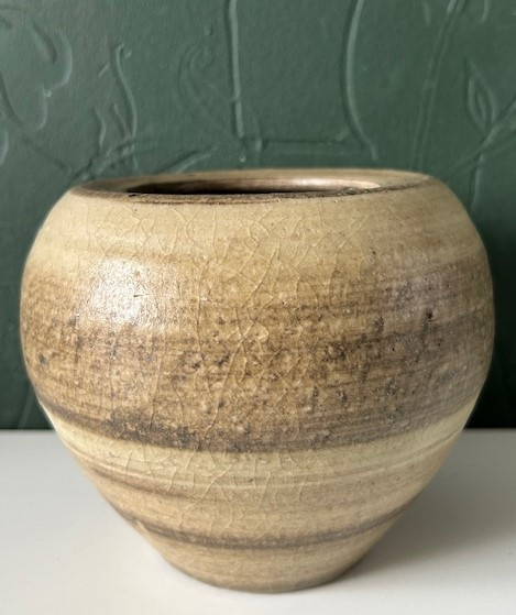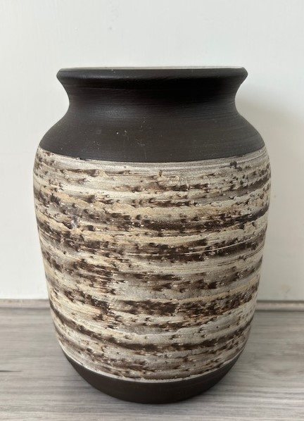 Mobach vaasje bruinMobach stevig vaasje met licht- en donkerbruin geglazuurde banen.