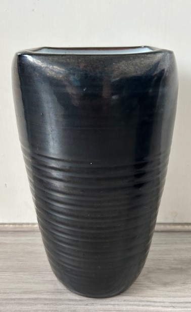 Nagtegaal vaas antracietNagtegaal handwerk vaas met 'deuken' uitgevoerd met antracietkleurig glazuur.